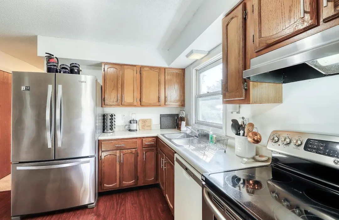 Additionally, an oven, kitchenware and a washing machine are available.